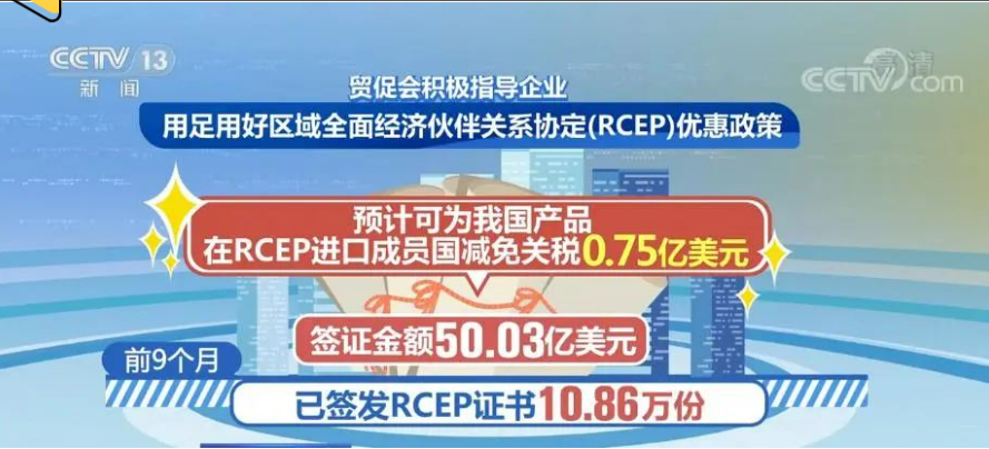贸促会指导企业用足用好区域全面经济伙伴关系协定(RCEP)优惠政策,前9个月已签发RCEP证书10.86万份,签证金额50.03亿美元,预计可为中国产品在RCEP进口成员国减免关税0.75亿美元。